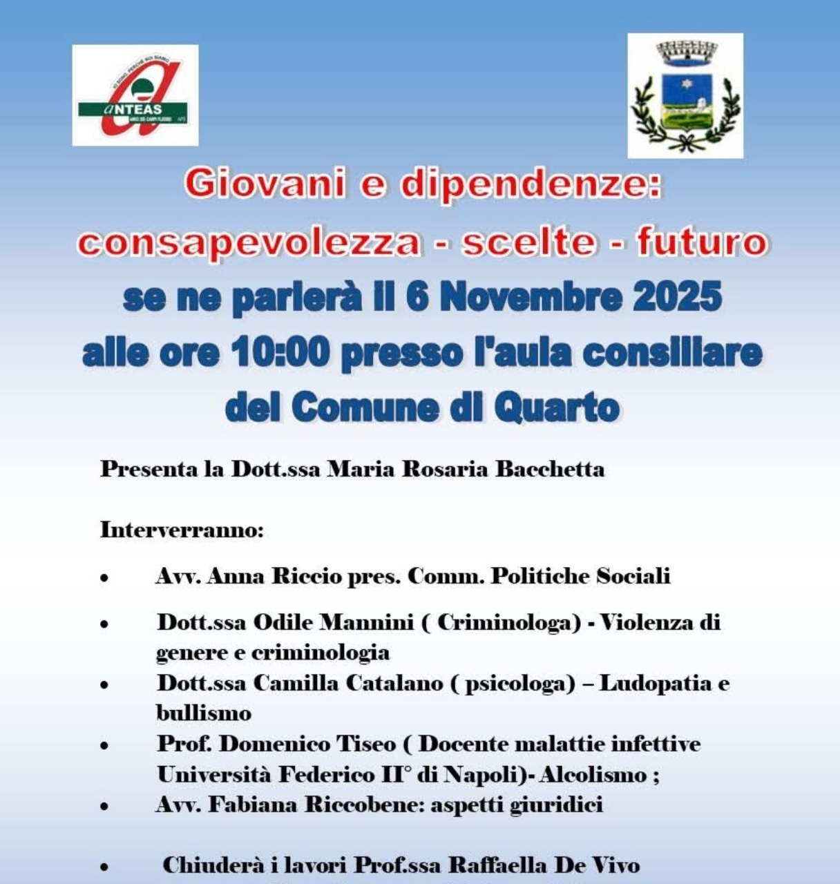 Giovedì 6 Novembre 2025 alle ore 10.00, presso l’aula consiliare del Comune di Quarto, l’Associazione Anteas amici dei Campi Flegrei aps, con il patrocinio del Comune di Quarto e di concerto con l’Assesorato alla cultura e politiche sociali, presenta l’evento “Giovani e dipendenze: consapevolezza – scelte – futuro”. L’evento illustrerà tematiche rivolte ai giovani sulle dipendenze da ludopatia – alcolismo – violenza di genere – bullismo e aspetti consequenziali giuridici.