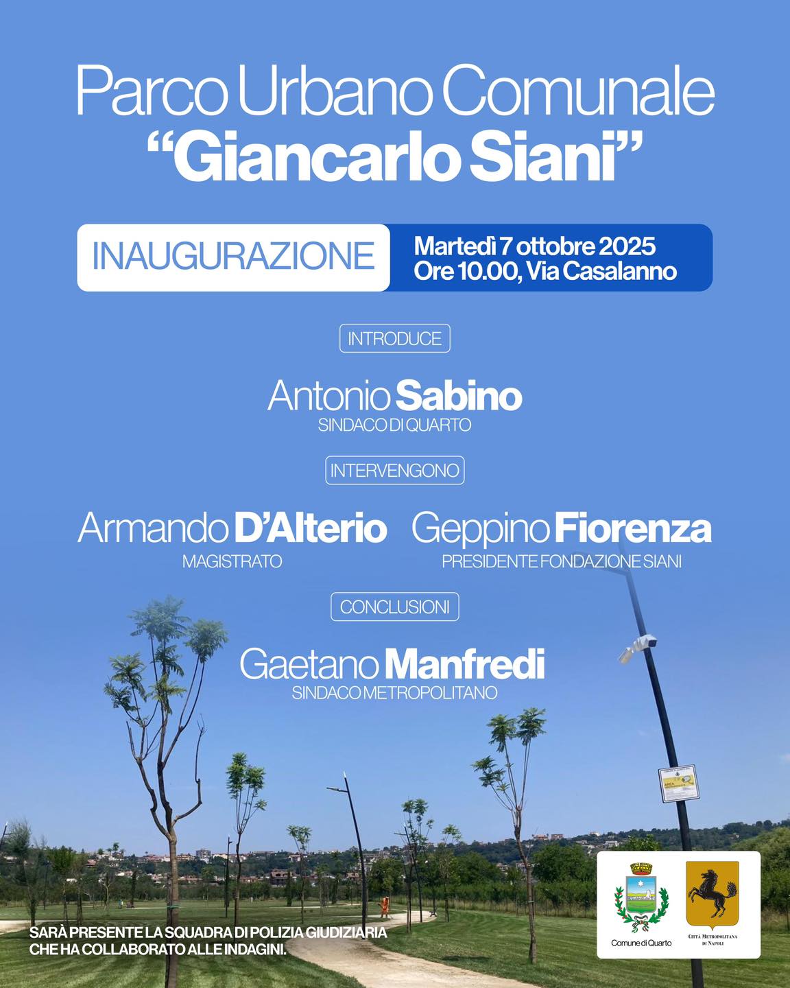 Martedì 7 Ottobre 2025 ore 10,00 inaugurazione Parco Urbano Comunale di Quarto in Via Casalanno dedicato alla memoria di Giancarlo Siani